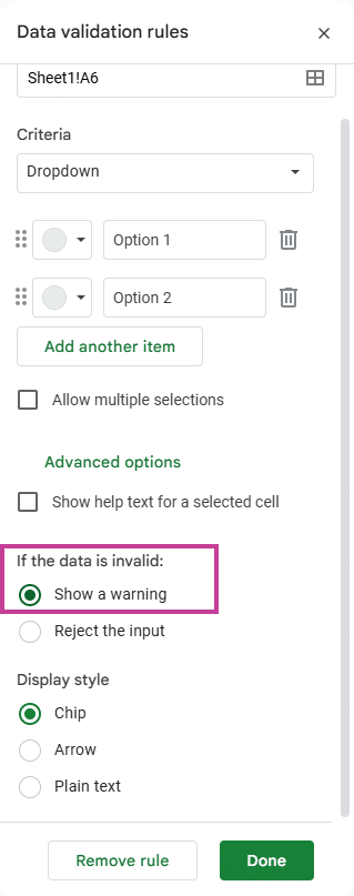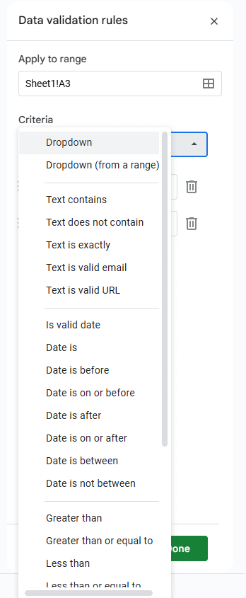 First, select the cells with data validation and navigate to the Data Validation settings. The data validation dialog box will appear and display the rules you initially set up. Now, you can change the cell’s criteria, error alerts, and more. Click Done to apply your new fine-tuned settings.