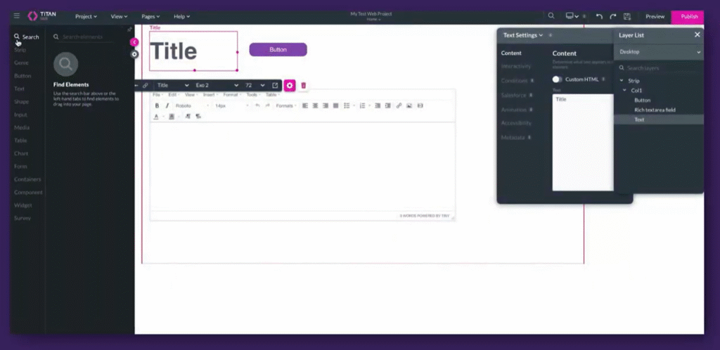 Titan Web elevates how you build web portals and sites. For example, Salesforce admins can create fully fledged web apps using drag-and-drop tools. Titan Web even works well with available components that can then be: