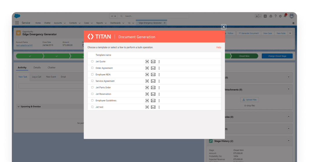 With Titan, you can build custom templates in multiple formats for any document you can think of: quotes, invoices, proposals, presentations, contracts, legal agreements, financial document generation and reports, certificates, fillable PDF forms , Salesforce document management and so much more – directly from Salesforce.