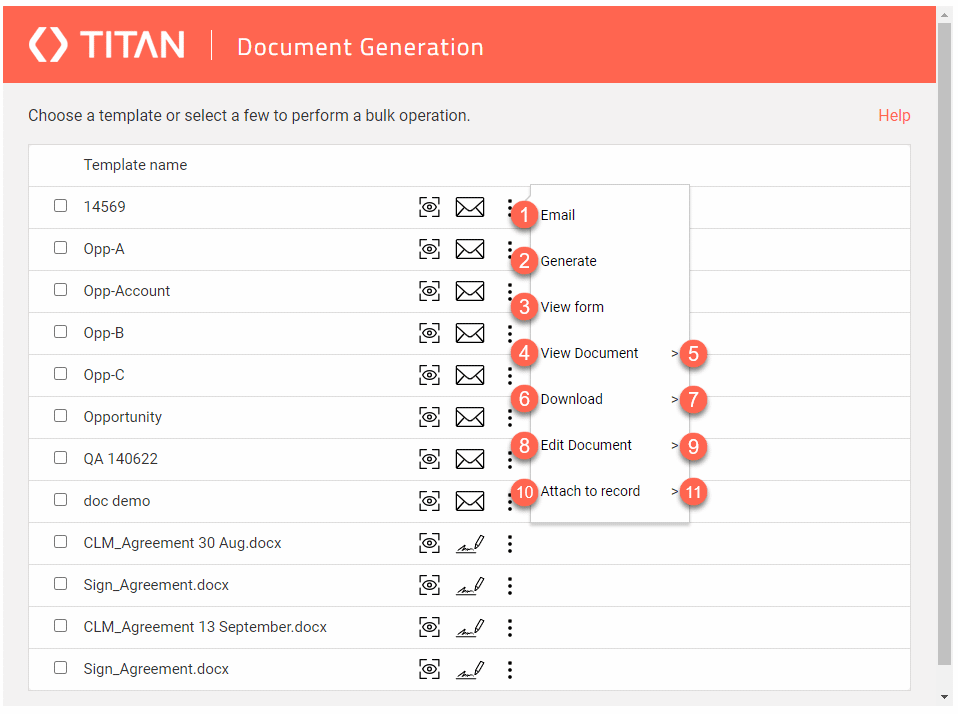 Titan lets you generate a document in Salesforce. When you click the FT Generate Document button in Salesforce, the templates you have permission for are shown in a modal.