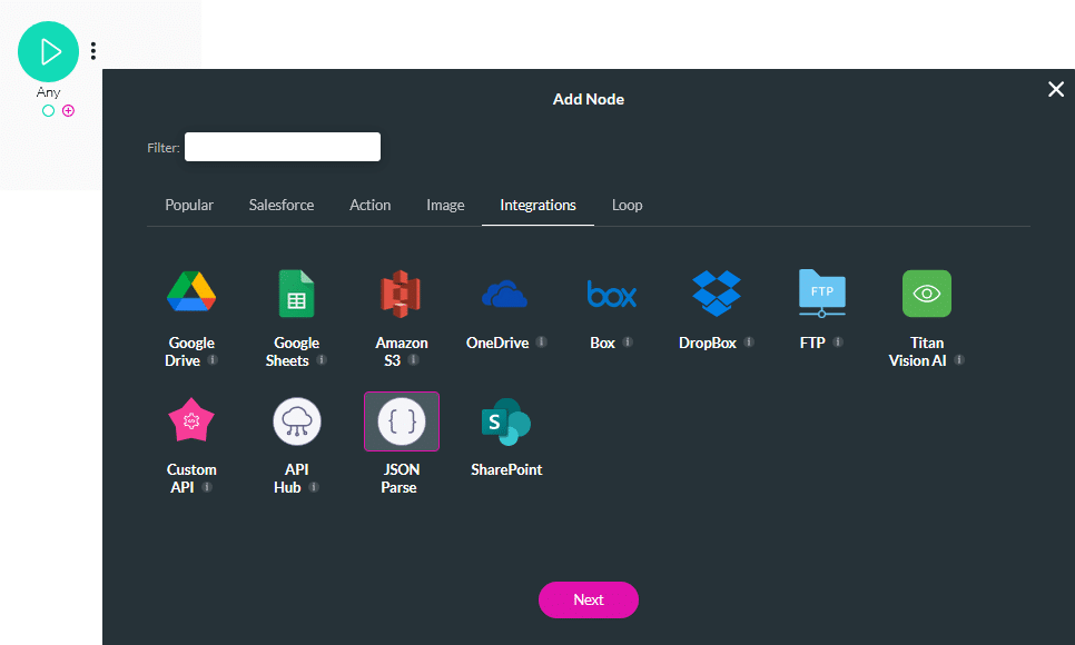 Titan’s JSON Parse node reads a JSON string from a variable and generates a JSON tree. Each field in the tree can be assigned to a static variable. Nested JSON is processed automatically, so all levels of the structure can be used in your Flow.