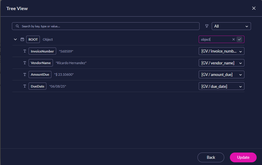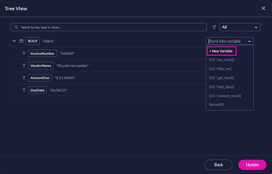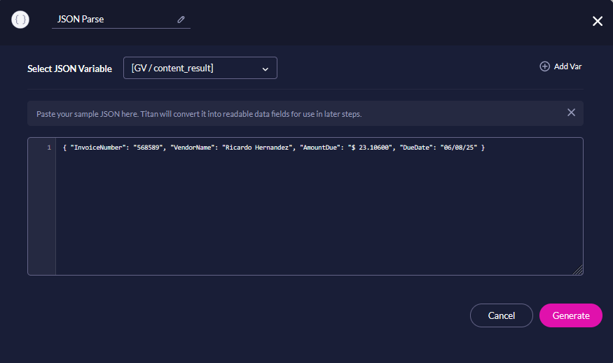 Titan’s JSON Parse node reads a JSON string from a variable and generates a JSON tree. Each field in the tree can be assigned to a static variable. Nested JSON is processed automatically, so all levels of the structure can be used in your Flow.