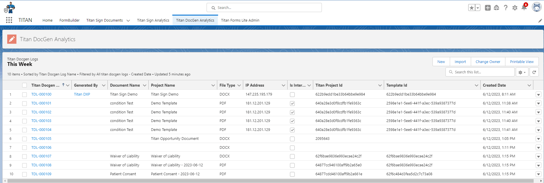 The Titan Doc Gen Analytics tab will open to display Titan Doc Gen Analytics. This contains the Titan Doc Gen Logs for this week: