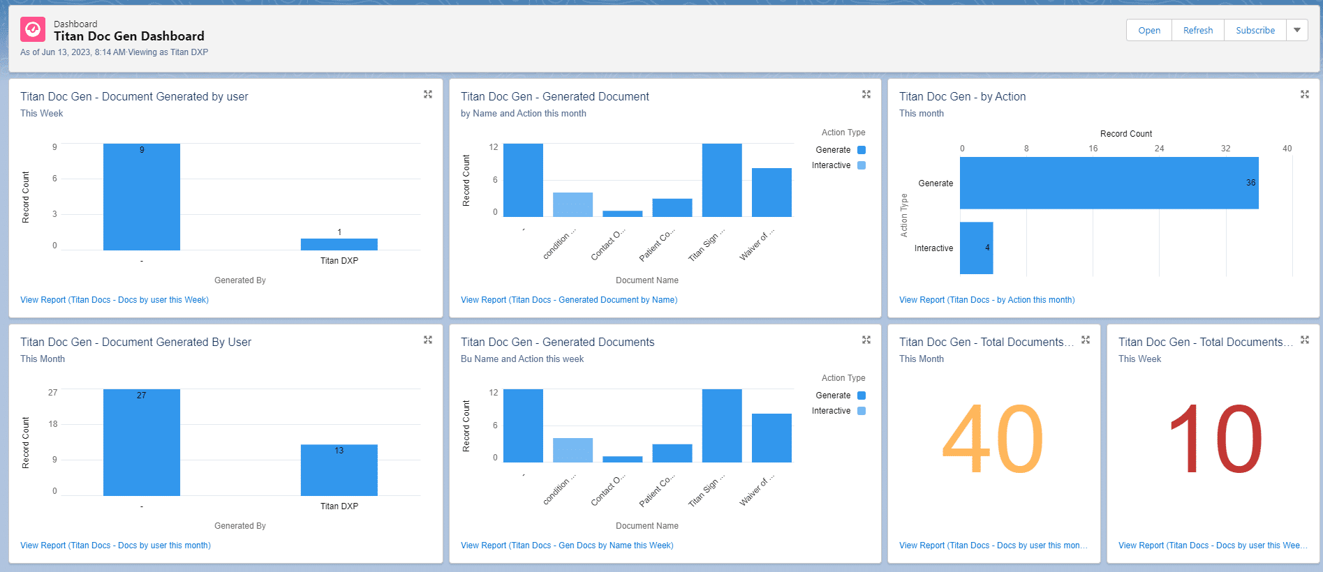 Below, you can view the Titan Doc Gen Dashboard, which includes the following reports: