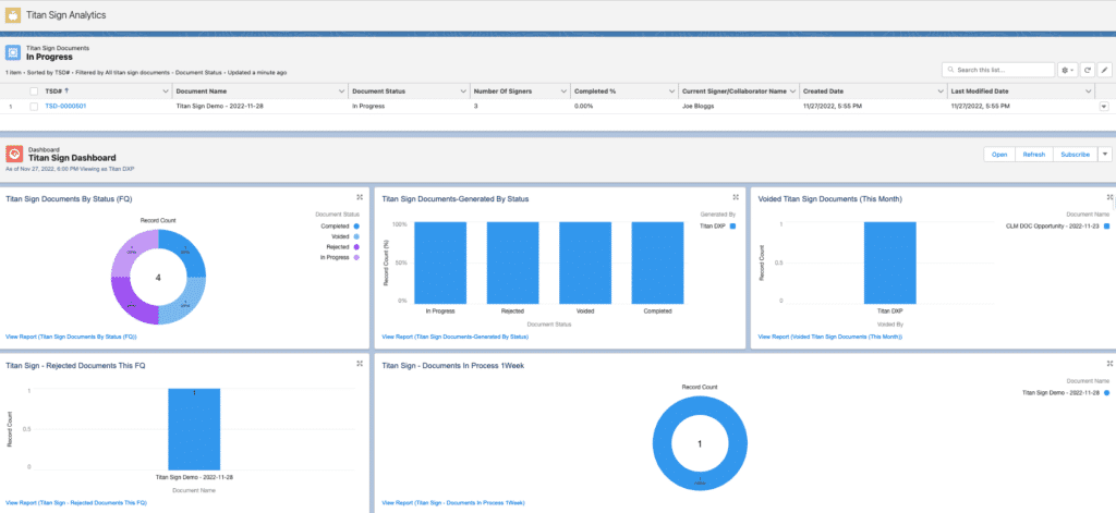 This component displays Titan reports and dashboards for Titan Sign. On the dashboard, reports are converted into charts. Examples of this include Titan Sign Documents by Status (FQ) and Titan Sign Documents- Generated By Status.