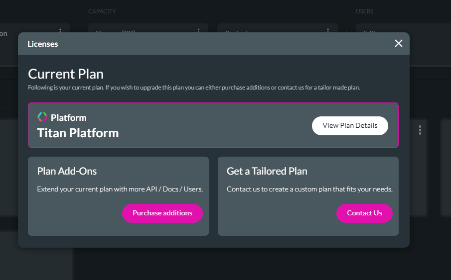 View your current license, including the type, period, and costs. Ensuring you have the correct license type will optimize your business processes. You can choose to upgrade your license by using your credit card or contacting the Titan team.