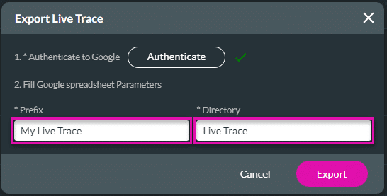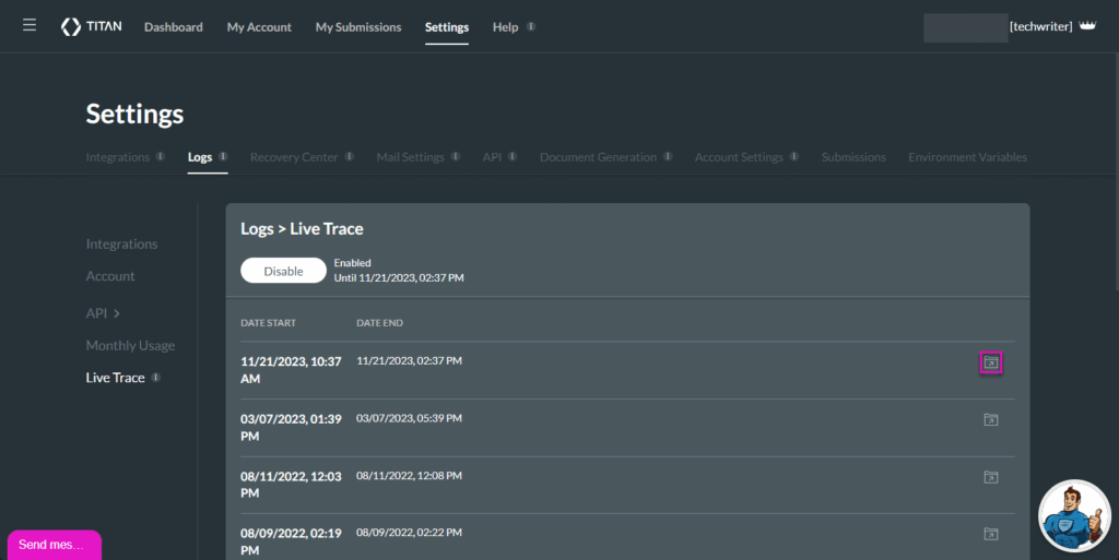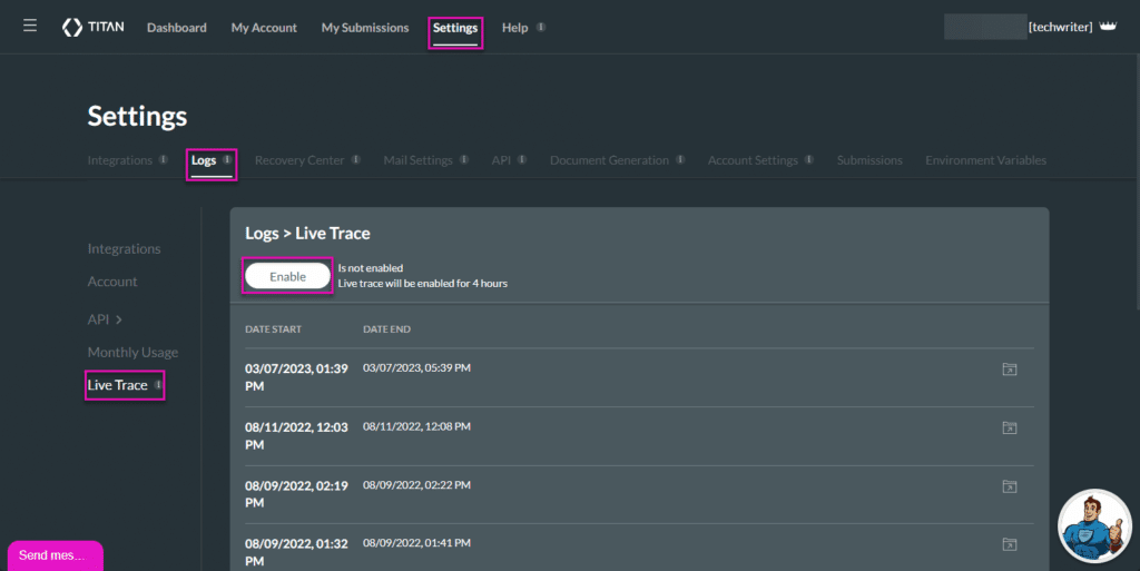 Enable Live Trace to capture (in the background) all integrations done on your Titan account for a period of four hours. (It will automatically be disabled after four hours.) This only applies to products in Production (not in a testing environment). You can download the log file as a .csv file and use it to debug errors or see issues that cannot be reproduced in the testing environment. You can analyze the downloaded file in Excel, Google sheets, or a similar application.
