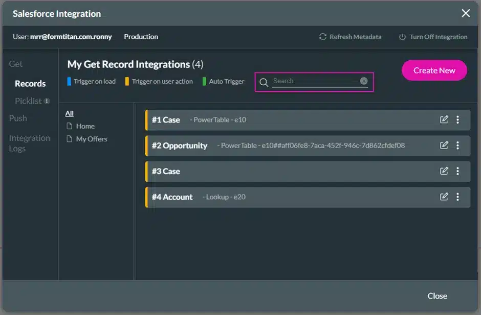 | Column E | This is the ID of the integration action. Project Settings > Salesforce > Records ![]() Copy the integration ID and paste it in the Search field. The relevant record will be shown. |
