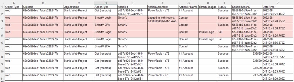 | Column I | This describes the status of the action type that happened in Column D. If the action failed, the error message will be shown in Column H. |