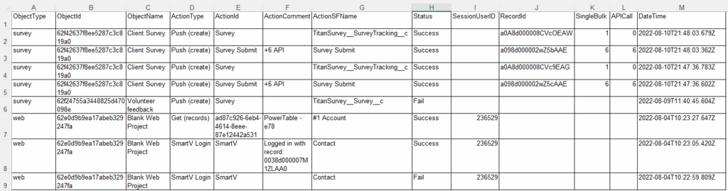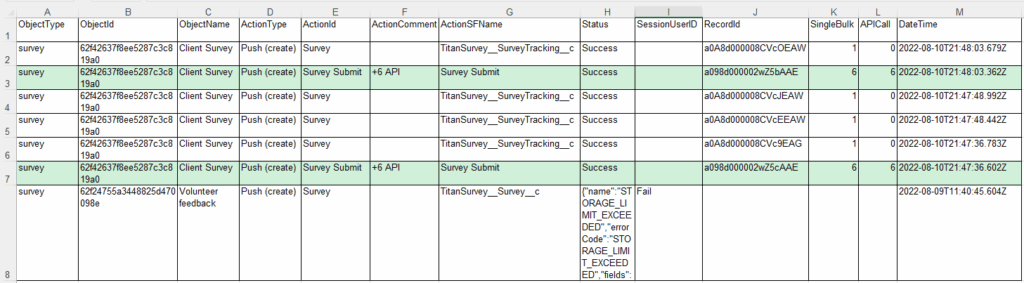 Use the data to analyze, debug, and reason for many API calls. An API call is logged for each integration action between Titan and Salesforce. You can use any of the standard spreadsheet filters to filter the data.