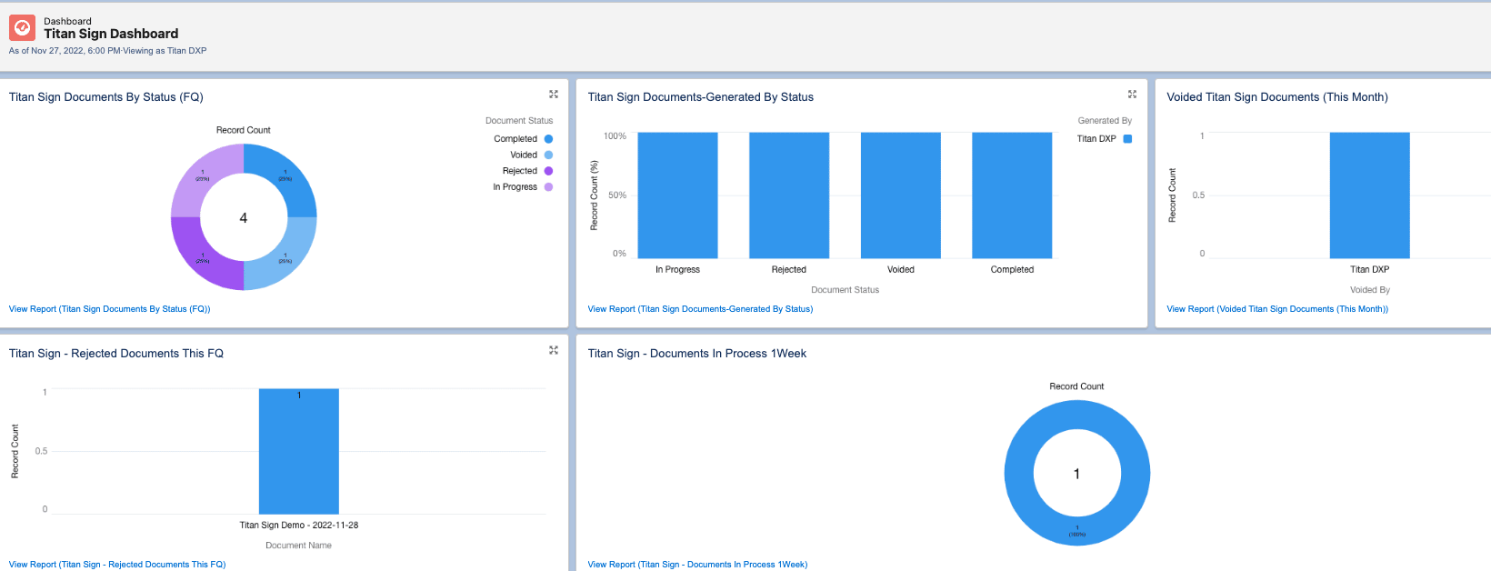 You will see a collection of reports converted into charts on the Titan Sign Dashboard.