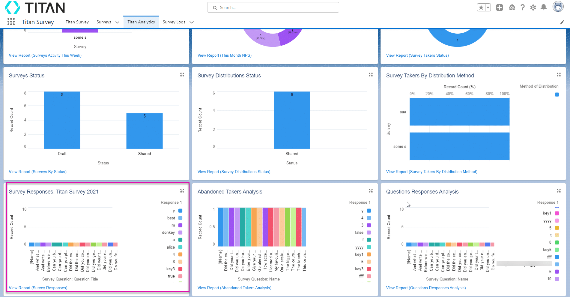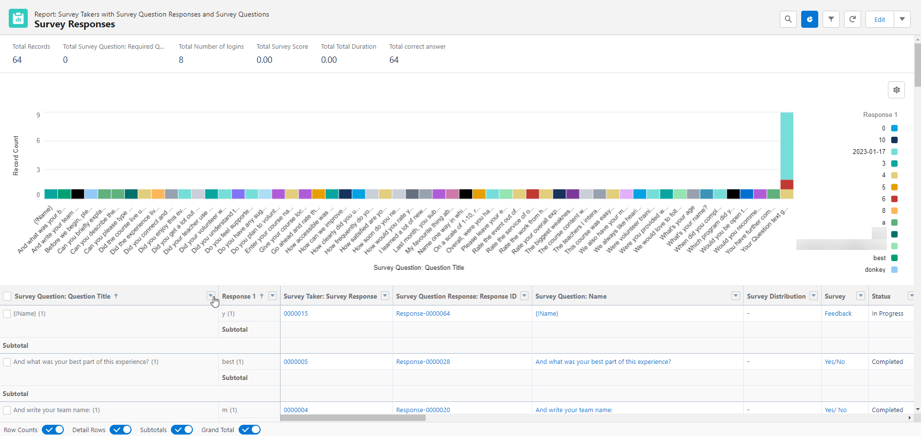 This report displays activity on Survey Responses. On this report you will find information such as total number of logins, correct answers, survey duration, and total records.