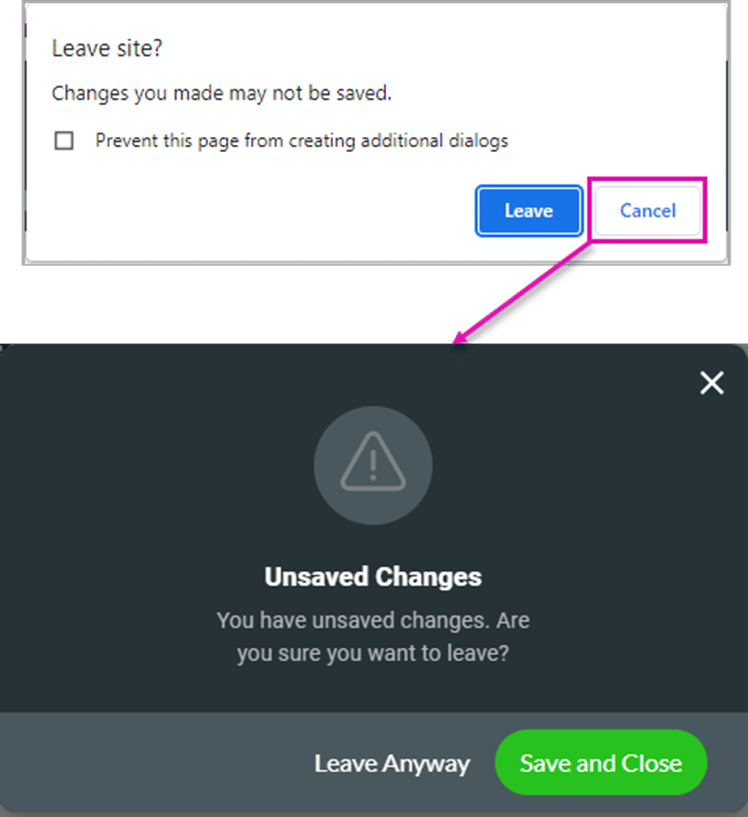 We added protection that will warn a user that they have unsaved changes when they try to close the Titan Sign builder. An alert message will be shown. Clicking on the Leave button will close the page without saving any changes. Clicking on the Cancel button will open a second alert.