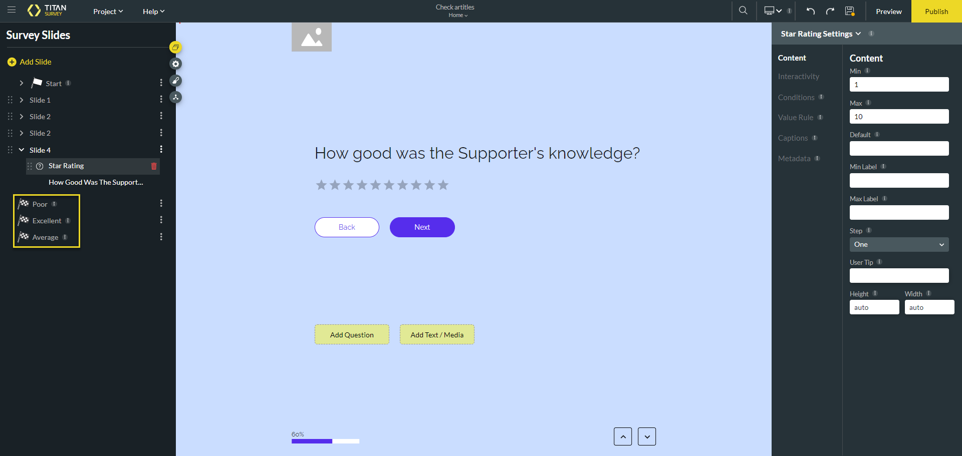 Prerequisites: Make sure you have a survey slide where the user can select options. In this example, a star rating is used.