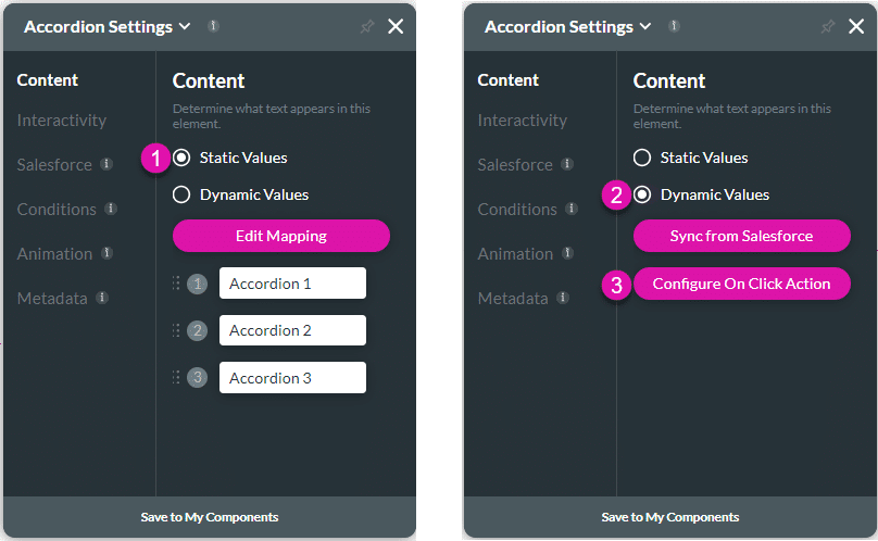 | 2 | Dynamic Values – Sync from Salesforce | Use the Sync from Salesforce button to configure values from Salesforce. |