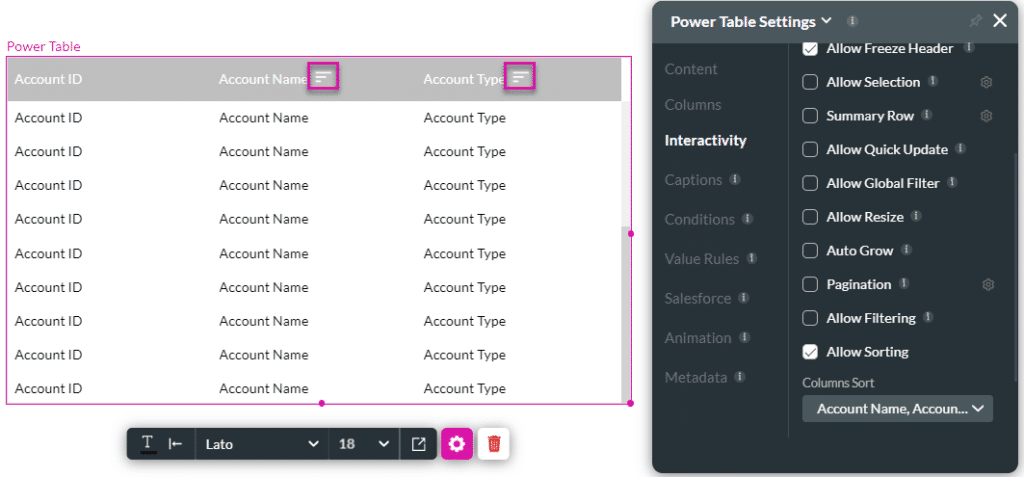 The Allow Sorting option is available for the Power Table and Table elements. Use this option to sort data systematically for better understanding.