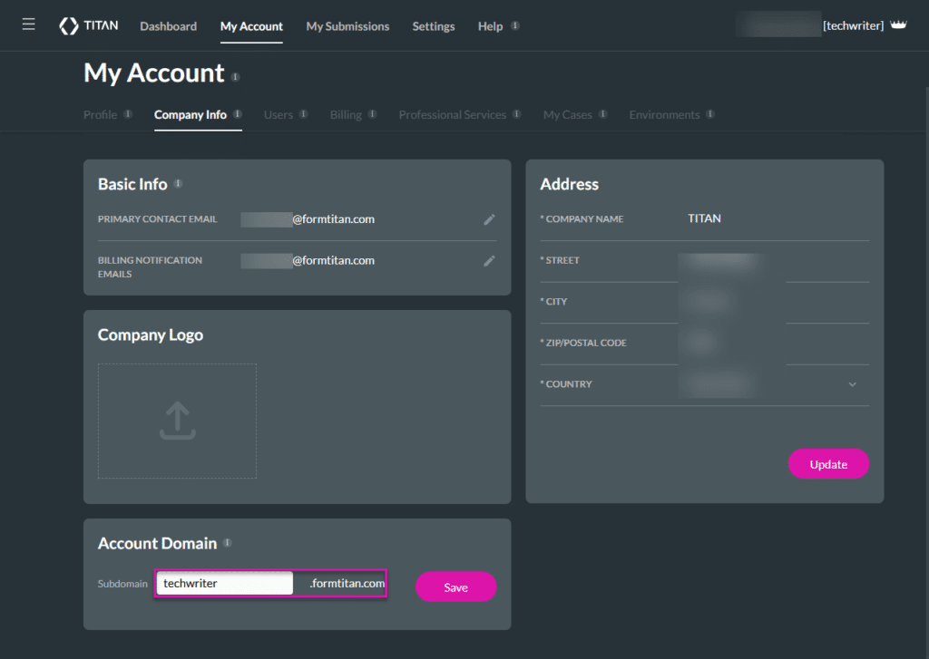 You can find the account domain under the My Account > Company Info tab on the Titan Dashboard.