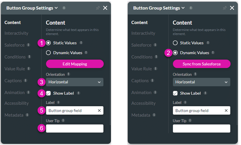 | 1 | Static Values – Edit Mapping | Change the static value mapping of the button group after you add it to the Web project. Use static values to set pre-defined labels, values, and/or descriptions. These values are set on a project level and are not pulled from Salesforce. |
