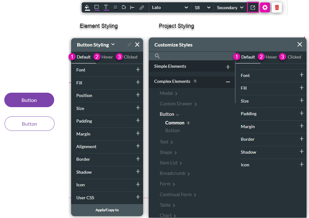 The Button element is an interactive graphic control that enables users to trigger an action. The Titan Web builder has two types of buttons: Primary and Secondary, and they can be styled on the Project Style Level and Element Style Level.
