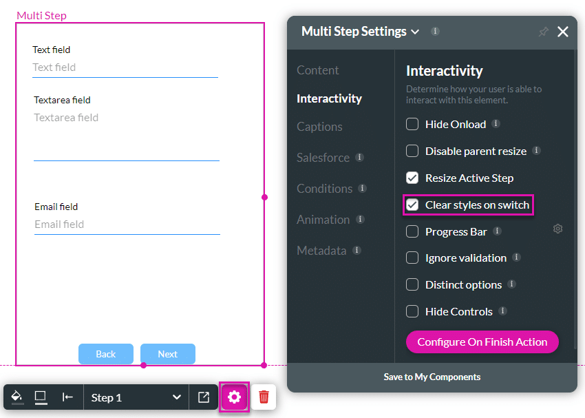 If the Resize Active Step option does not work for your multi-step container, use the Clear styles on switch to ensure that each step resizes based on the content of that step dynamically.