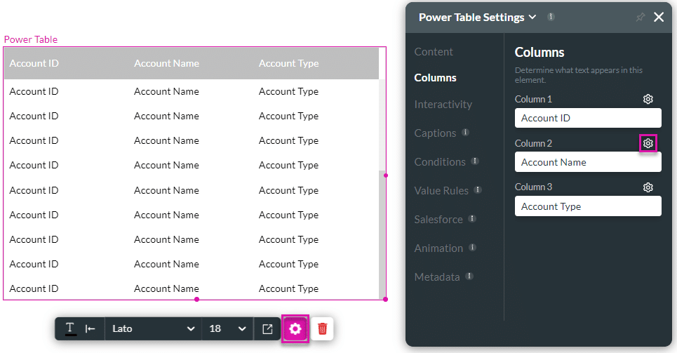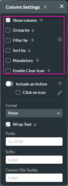 The Columns option is available for the tables, power tables, and list views. This option allows you to change the structure and format of the displayed information.