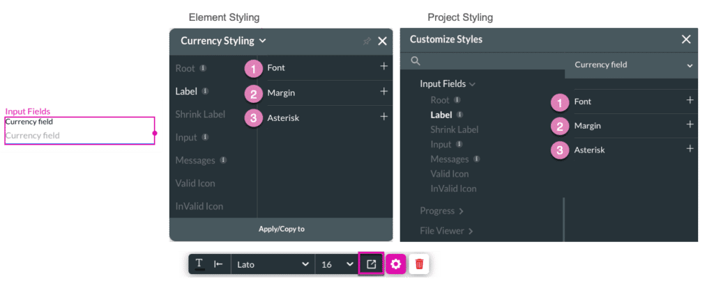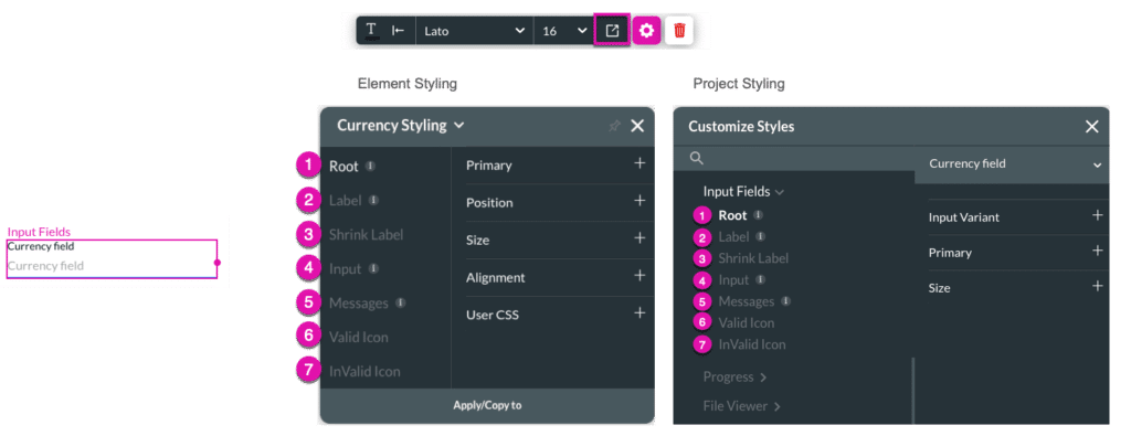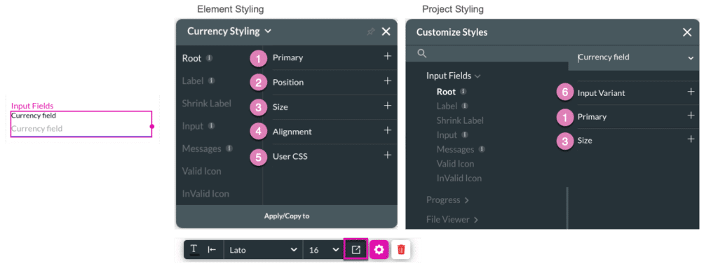 The currency element can be edited on both the Project Style Level and Element Style Level.