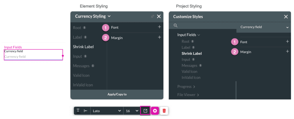 | 3 | Shrink Label | You can use the Shrink Label to control the style of the elevated label when the input label is configured as floating. The Shrink Label option is available under the Standard, Filled, and Outlined variants on the project styling properties, and is not found on the Classic and Fixed variants. |