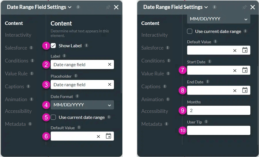 Customize the content options and determine how other elements appear in the Date Range input element.