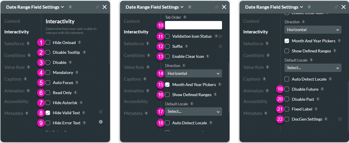 | 17 | Default Locale | Use the Default Locale function to auto-translate inputs into the selected locale. This option is available for the following elements: Date Range, Date, Time, and Date Time. |