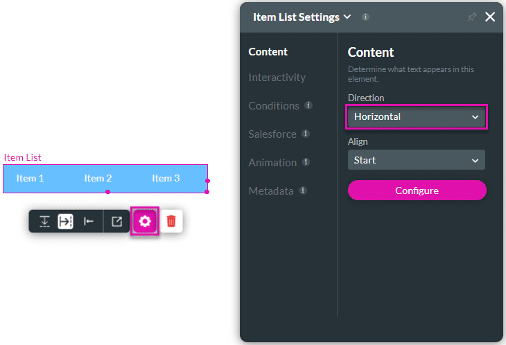 The Direction option is available for the Item list, Date Range, Auto Fit Container, and other elements. Use direction to align items vertically or horizontally.