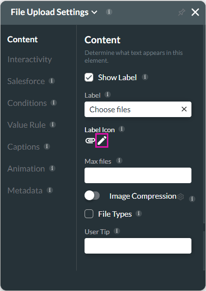 The Edit Icon option is available for many elements, such as the File Upload element. Use this option to edit the icon.