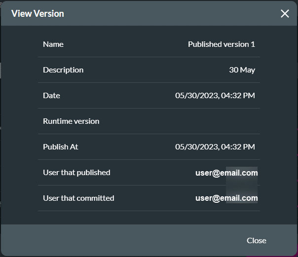 | View | Click the View option to open the View Version screen. The following information is shown: – Name – Description – Date in the formatDD/MM/YYYY, hh:mm AM or PM – Runtime version (the Titan software version) – Published at (only when the project has been published) – Email address of the user who published (only when the project has been published) – Email address of the user who committed the version