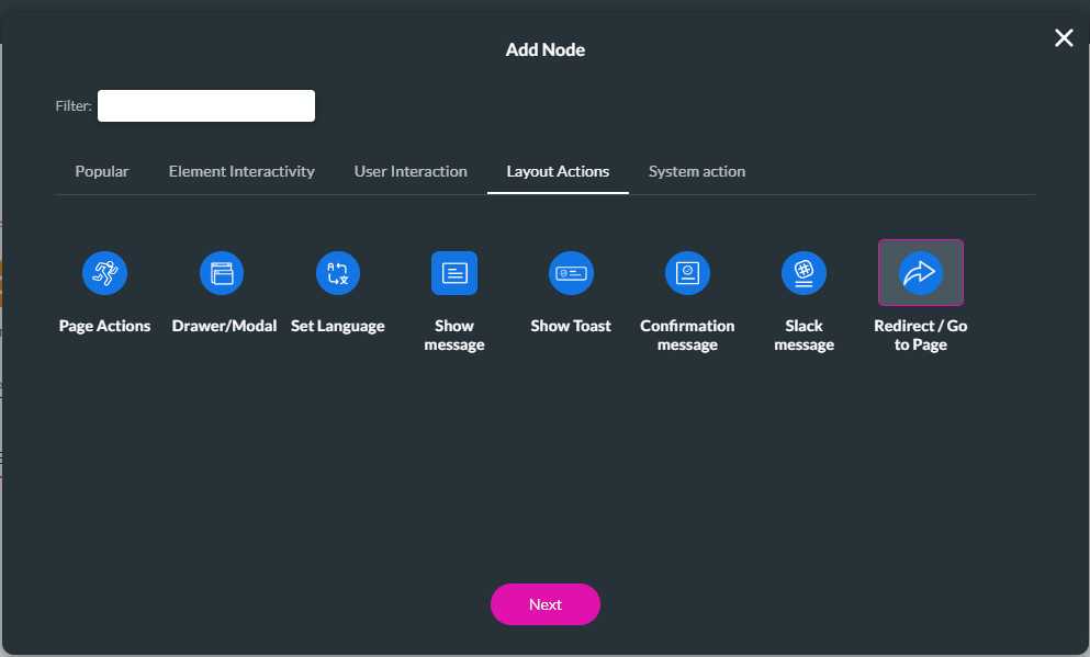 Add an internal or external redirect in a few clicks with no code.