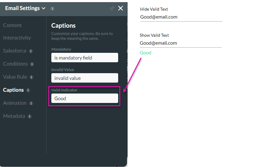 When the user types valid text in the field, the feedback text (for instance, Good) shows. When the Hide Valid Text option is enabled, the field will not show feedback text.