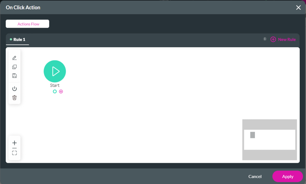 In this example, we have a form element in a stepper container where a customer can complete information fields, and three buttons with on-click actions, with the following actions: