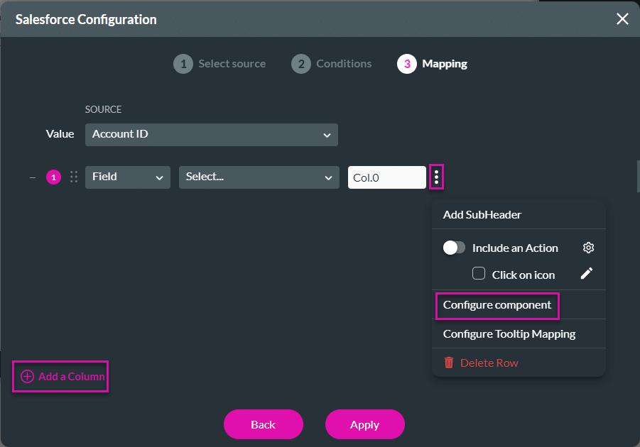 Gear button > PowerTable Settings > Content > Edit Mapping > Configure Component