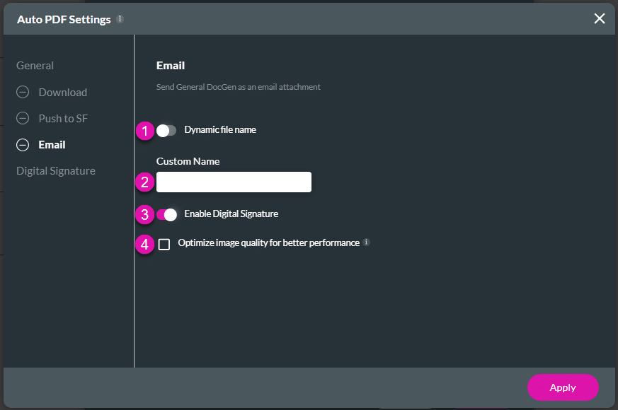 Make sure that you used the toggle switch to enable a Digital Signature, either under the Download, Β Push to Salesforce or EmailΒ option.