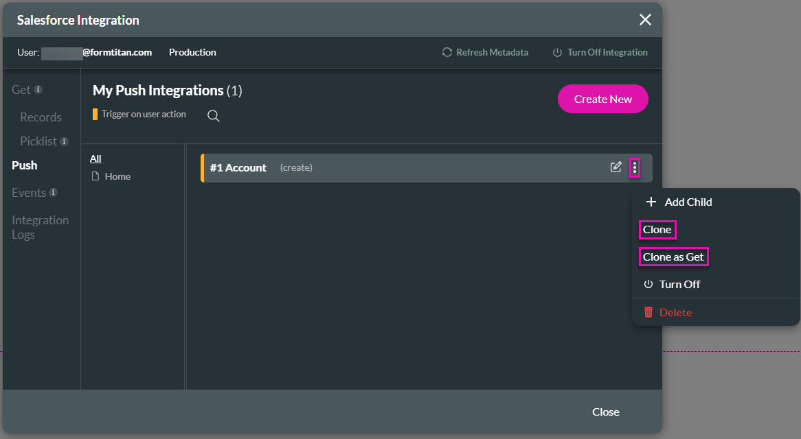 The Get integration that is cloned as a Push is added to the Push integrations list.