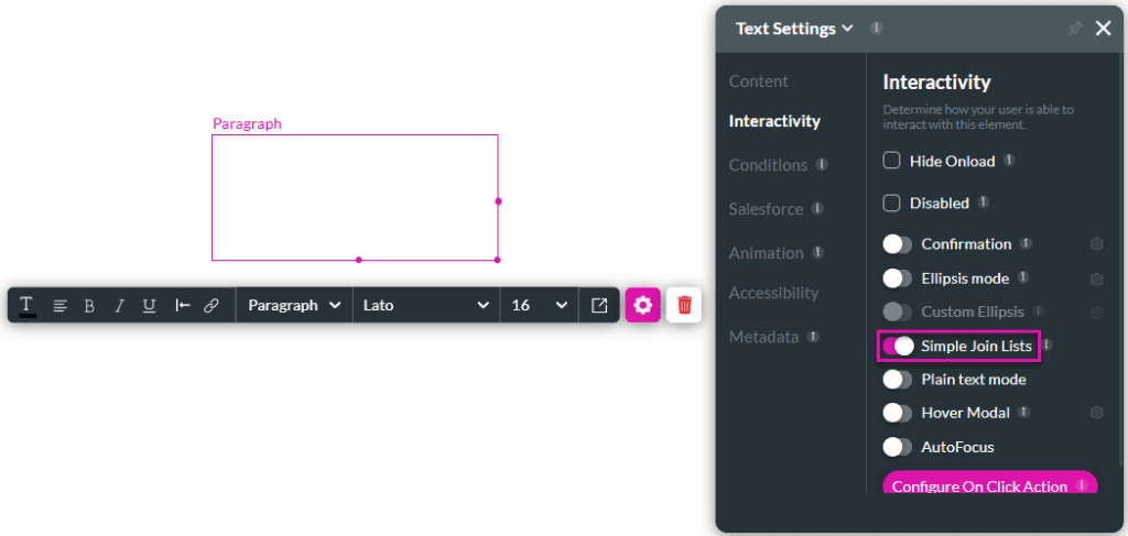 The Simple Join Lists option is available for Text elements. When using the Get method to retrieve multiple records from Salesforce into the same text element, they are separated by commas. Use the Simple Join List option to remove the commas.