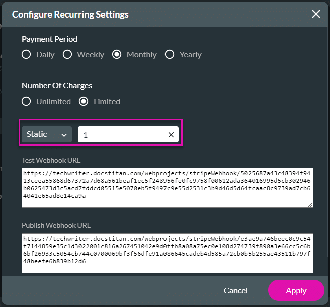 A webhook is an HTTP endpoint that receives events from Stripe. Refer to the Stripe documentation to use the webhook to trigger recurring payments.