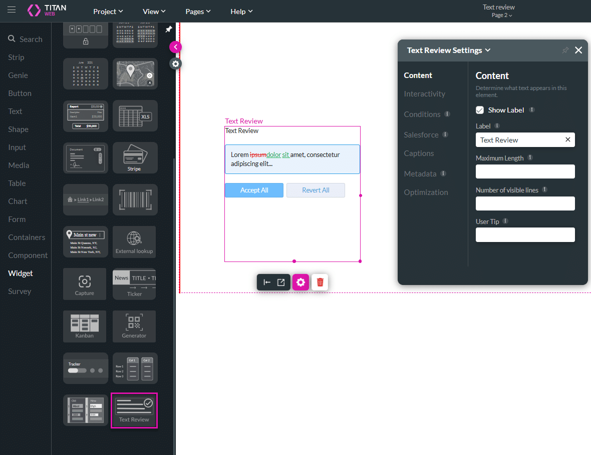 The text review widget is not available by default. Please contact Titan Support for more information.