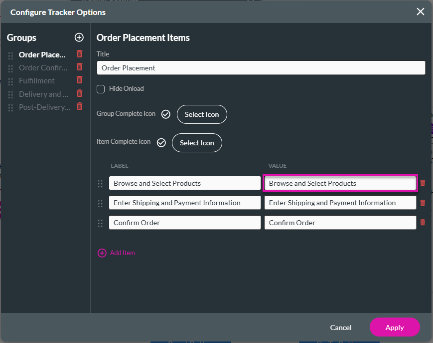 For the Static option, you must select the Item Value that you configured on the Configure Tracker Options screen.