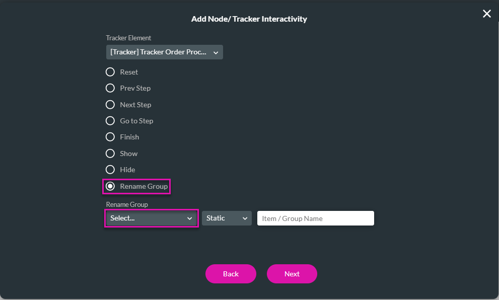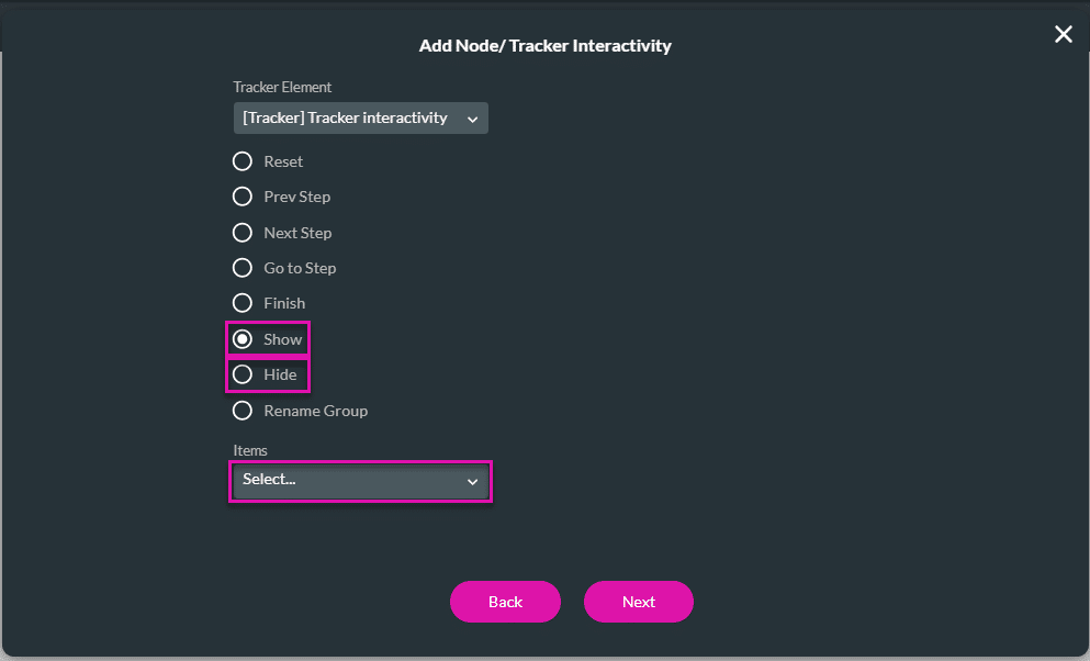 In this example, the tracker interactivity is added to a button. You can add any conditional logic.
