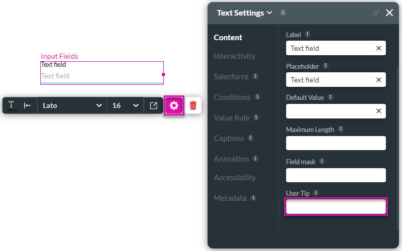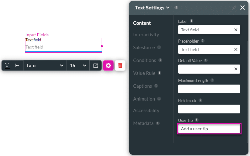 User Tips are available for different types of elements. For instance, if you don’t have enough space in the field, you can give the user a tip to provide more information or clear instructions.