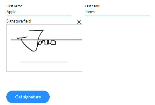When the user clicks the Get signature button, Salesforce will populate the First name, Last name, and Signature fields.